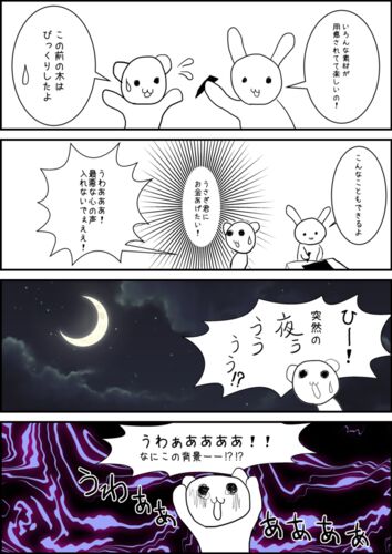 昨日の続き(?)な4コマ。 昨日のはこれだよ↓ ペンタブ色んなことできるから面白いなーってうさぎさんが言ってました。 ちょっと最近4コマブログみたいになってる・・・笑